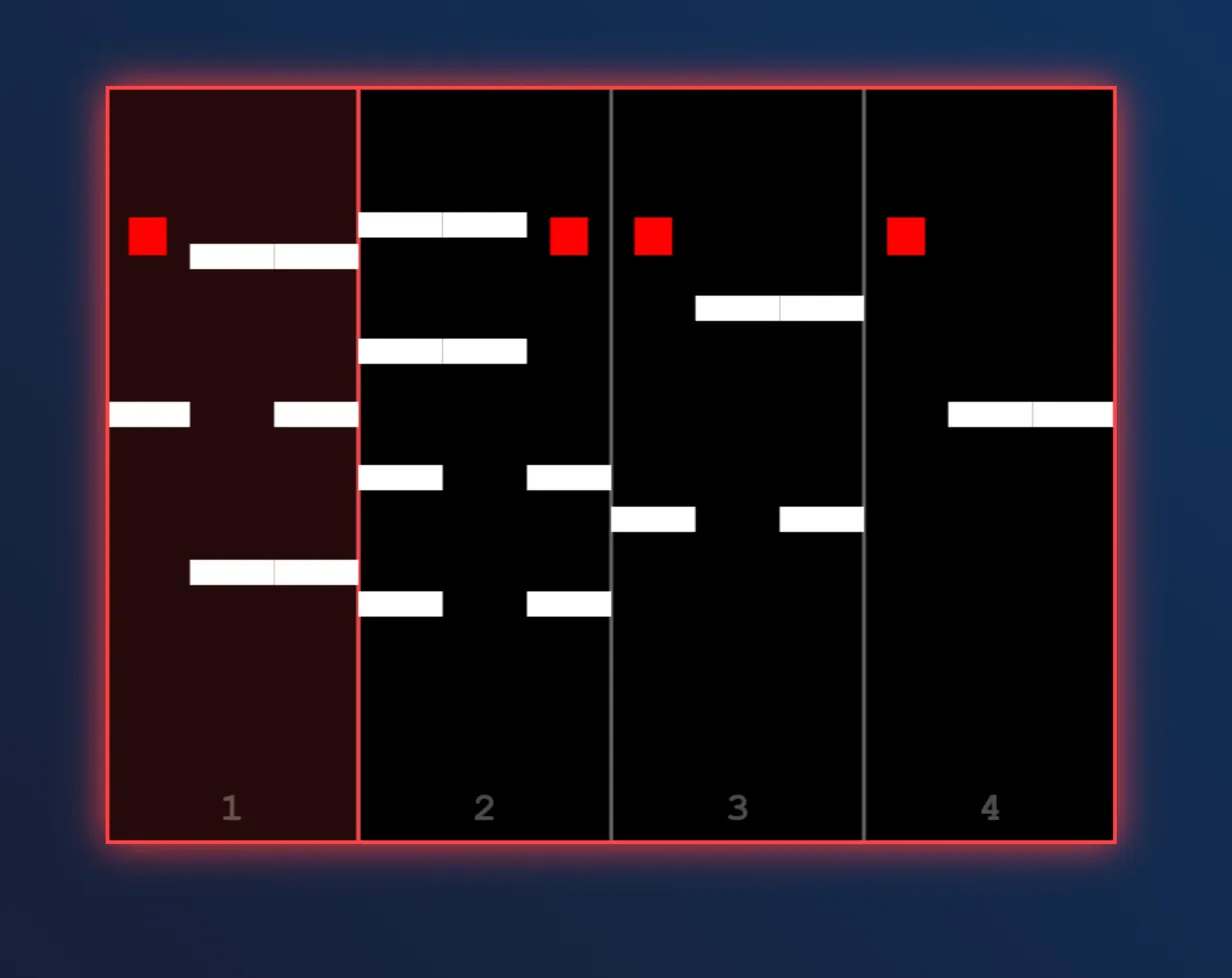 The challenge: Steer four objects through obstacles across four pathways. Objects move automatically bottom-to-top in their lanes. You choose pathways (keys 1-4) then control objects left-right with arrow keys.